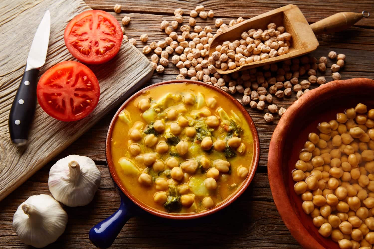 - Curry de garbanzos y verduras: Garbanzos, patatas, zanahorias, cebolla y especias típicas del curry.